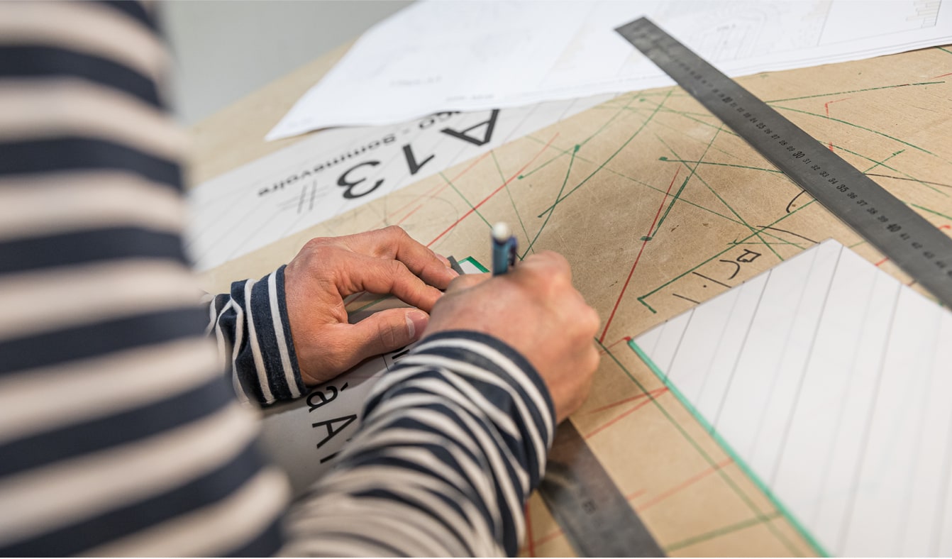 Il va d’abord élaborer les épures à l’échelle 1 nécessaires à la fabrication des panneaux qui serviront à la taille des pierres. Ces épures, telles les croquis en haute-couture, vont par la suite être utilisées pour fabriquer des gabarits.